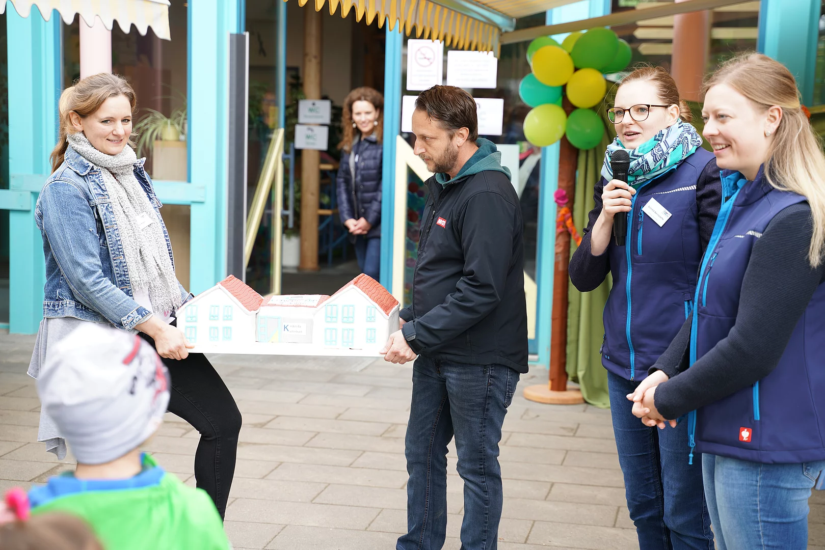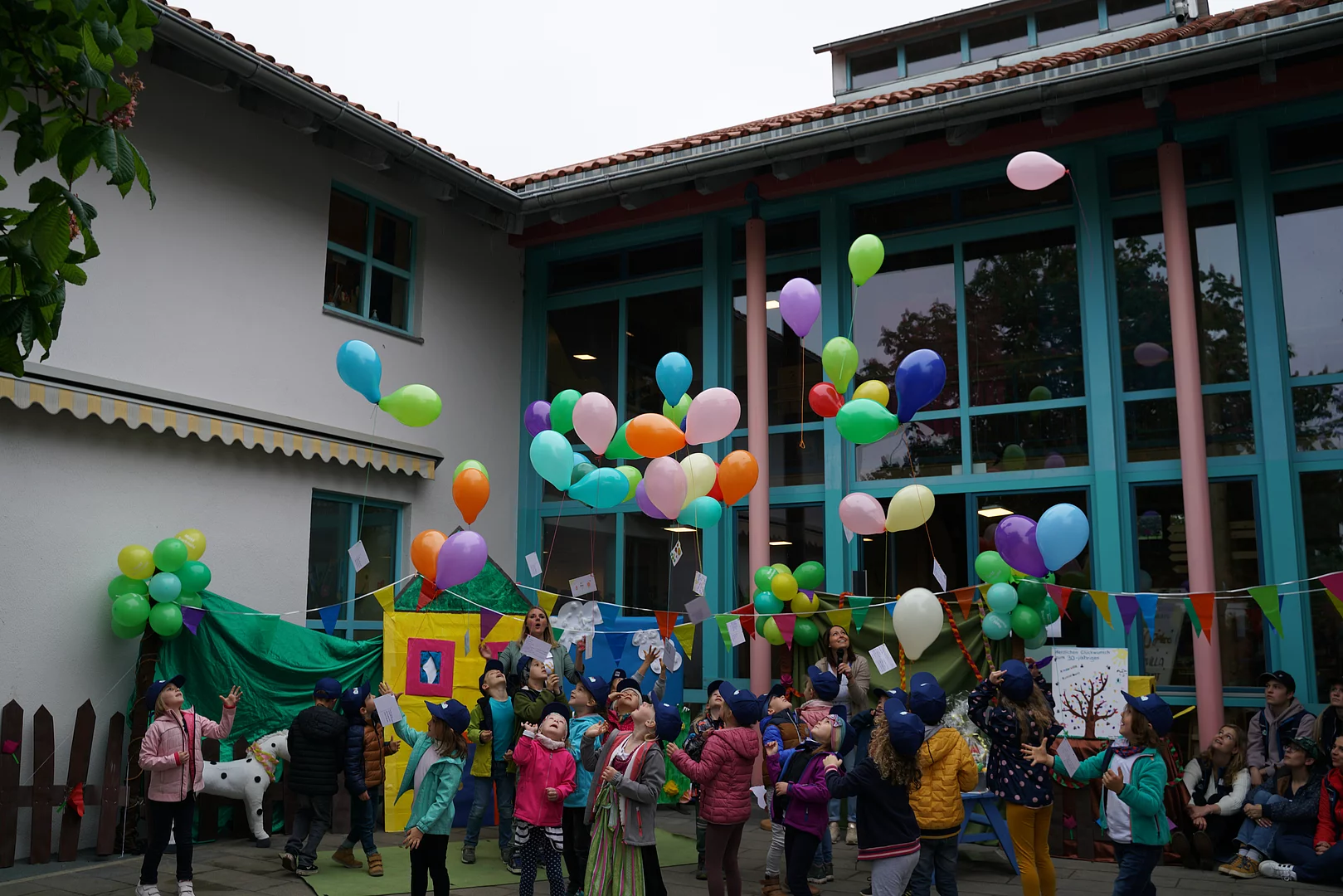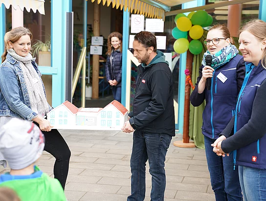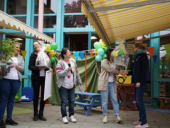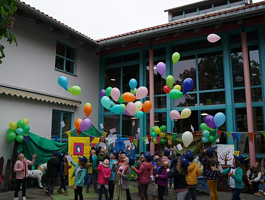 Als nächstes sprach der Elternbeirat mit Christine Engl und Sibel Öztürk zu den Gästen, sie dankten für das gute Miteinander im Kindergarten und ebenso den Sponsoren der VR-Bank und der Firma Salus die es möglich machten, dass sie der Kindervilla und somit ihren Kindern eine neue Matschbauküche ermöglichen. Auch sie hatten eine kleine Überraschung dabei, denn alle Vorschulkinder haben Karten mit Wünschen gestaltet, diese wurden an Luftballons in den Himmel geschickt - einige Flugkarten sind bereits zurückgekommen.