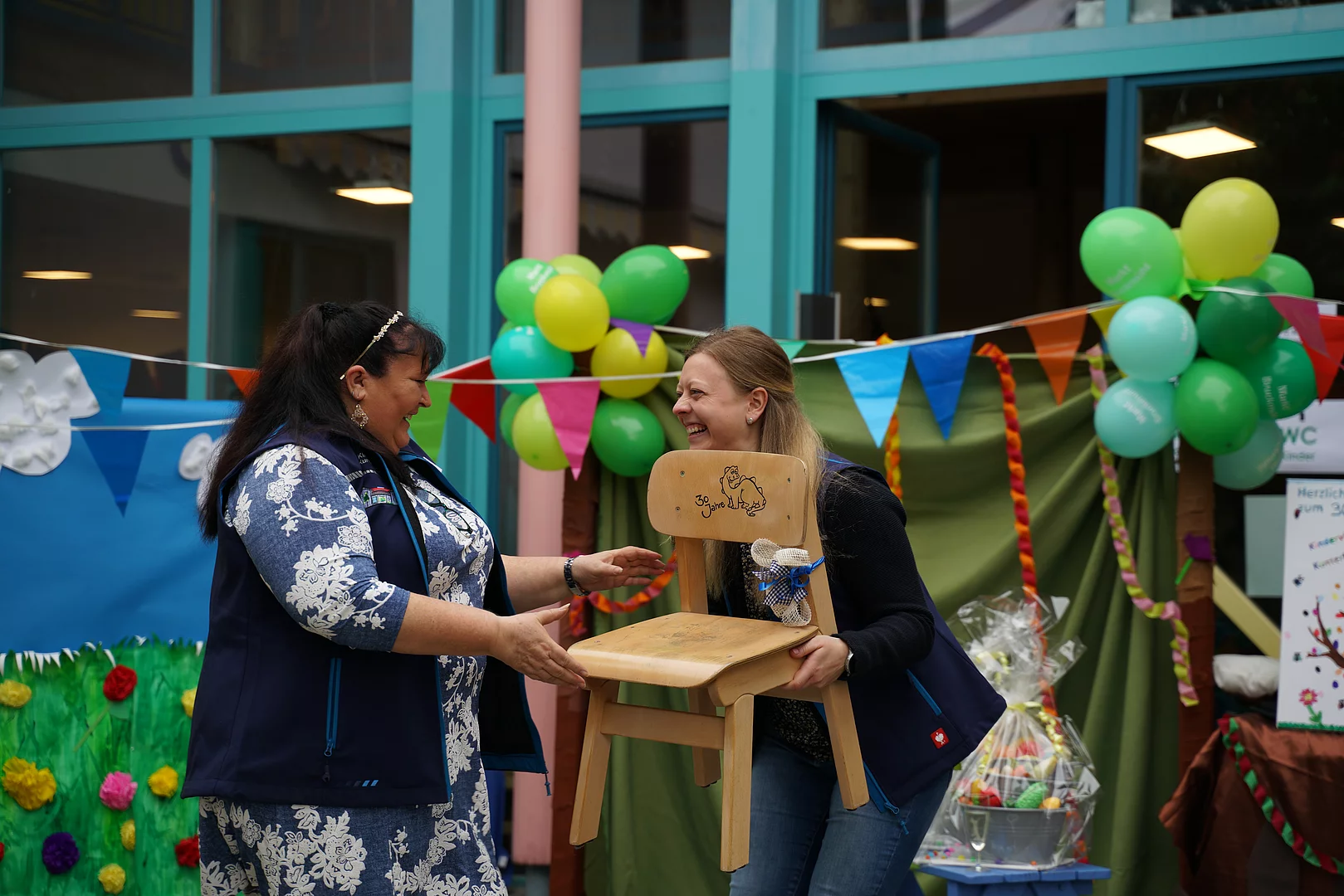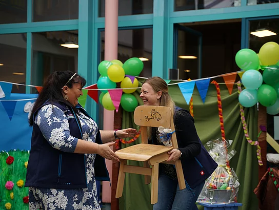 Ein weiteres und ebenso wichtiges Jubiläum war zu feiern, Veronika Irsigler hatte mit diesem Jahr ihr 30jähriges Betriebsjubiläum in der Kindertageseinrichtung „Kindervilla Kunterbunt“, dazu überreichte Schmid einen „ehemaligen Kinderstuhl“ als Erinnerung an die vergangenen 30 Jahre in der Dinogruppe und ein Blumengesteck als Dank für die vielen engagierten Jahre und die Treue zur Einrichtung. Gerade in der heutigen Zeit, in der viele ihre Arbeitsstelle zügig wechseln, ein anzuerkennender, großer Verdienst und keine Selbstverständlichkeit.