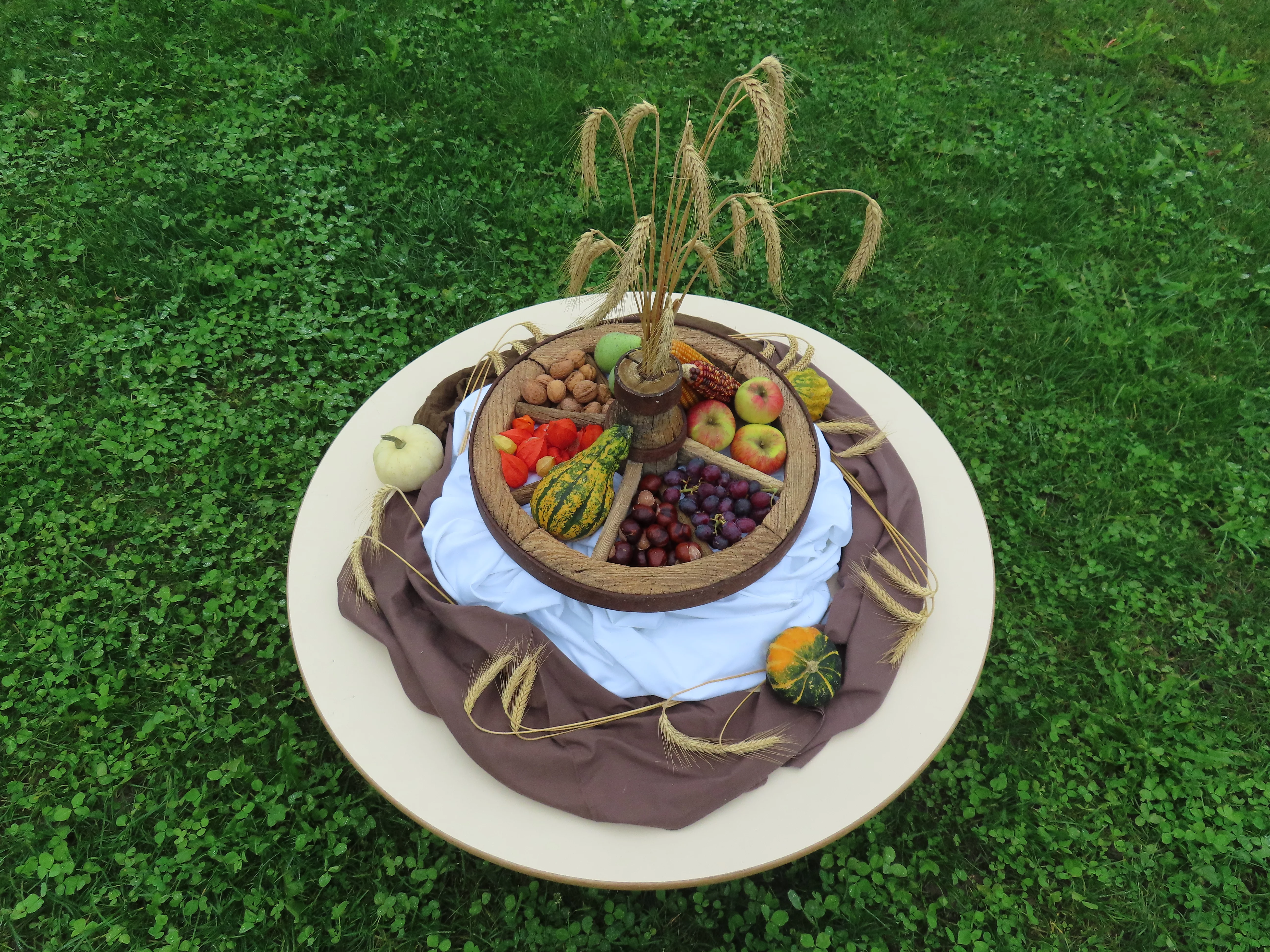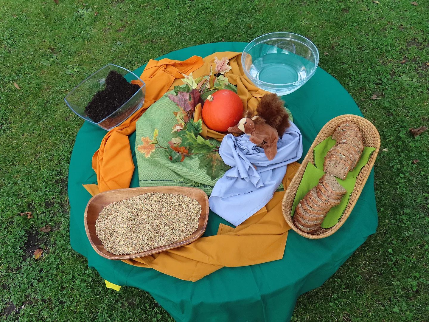 Am Morgen trafen sich alle im Garten und sangen gemeinsam das Lied "Danke für alle guten Gaben". "Puschel" das Eichhörnchen war zu Besuch und erklärte den Kindern, dass man um ein Brot zu bekommen, Getreide, Erde und Wasser, die Sonne und die Menschen braucht und das es wichtig ist auch Danke zu sagen, dass wir das alles haben. In der Kreismitte konnte man alles sehen und anfassen, Brot (selbstgebacken), Getreide, Erde, Wasser, die Sonne scheinte auch durch die Wolken und wir bildeten gemeinsam einen großen Kreis. Die Kinder wussten wieder richtig viel und erzählten eifrig.