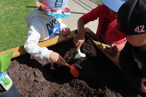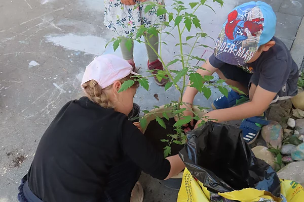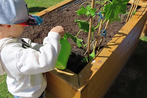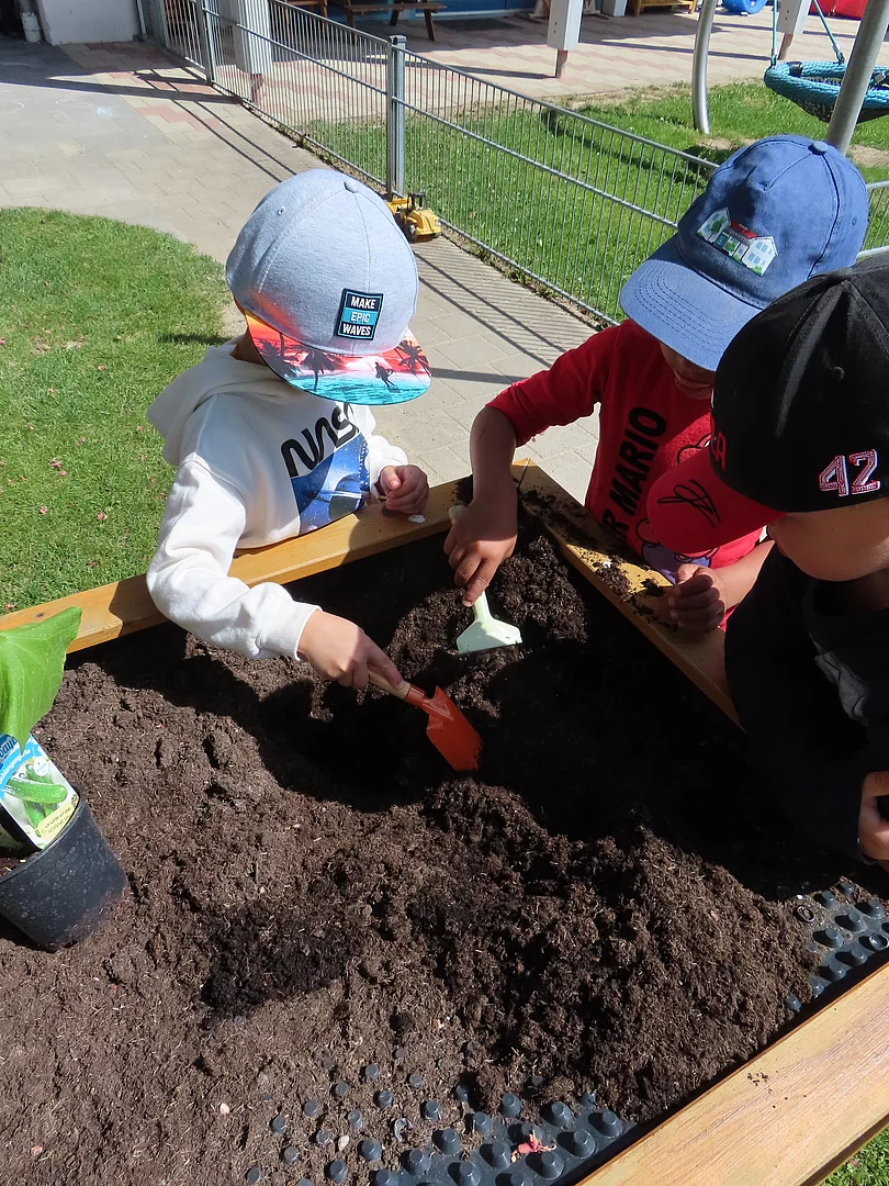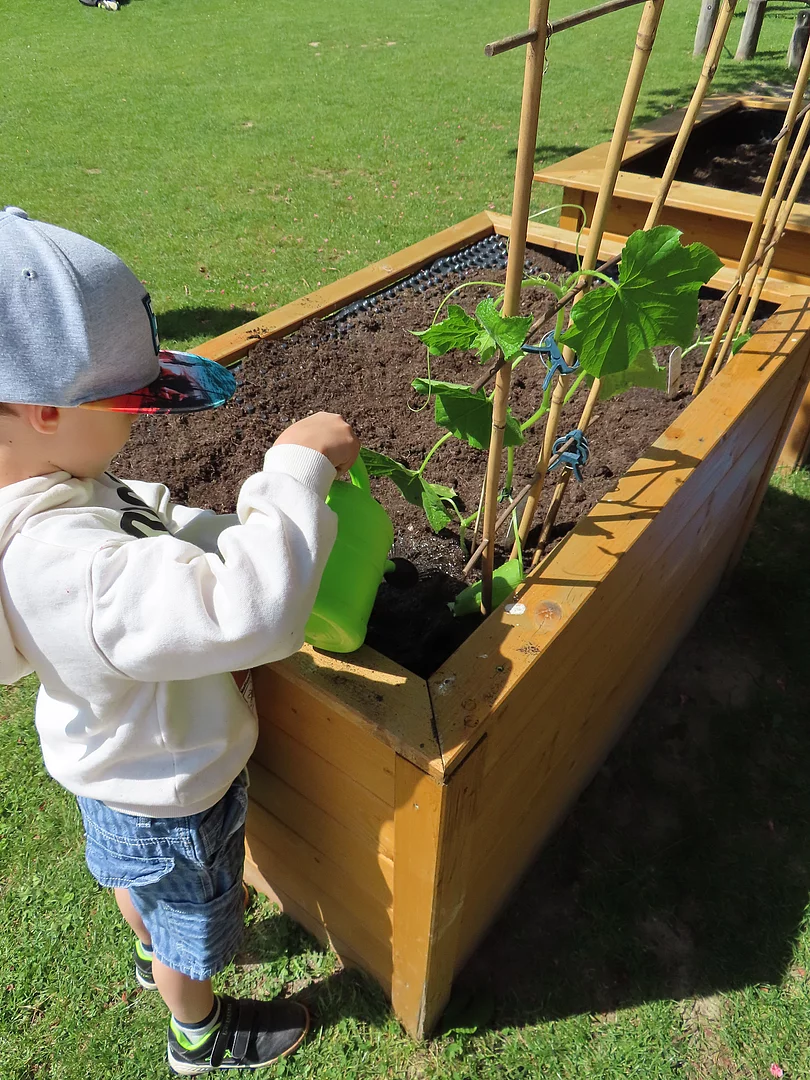 Juni 2024 Der Frühsommer ist da und wir freuen uns mit den Kindern wieder neue Pflanzen in unsere drei Hochbeete und vielen Töpfen zu pflanzen. Für die Kinder immer ein Ereignis, an dem sie gerne teilnehmen.