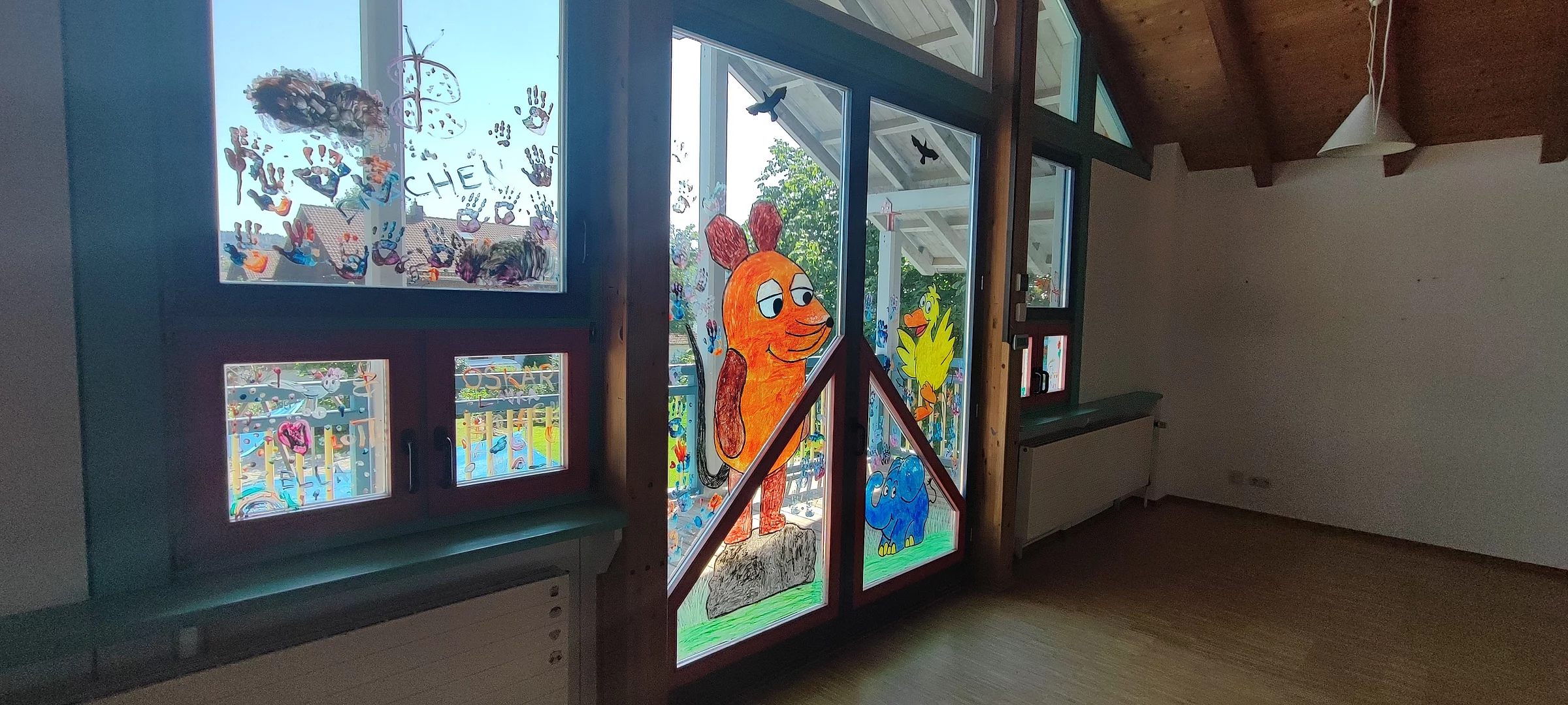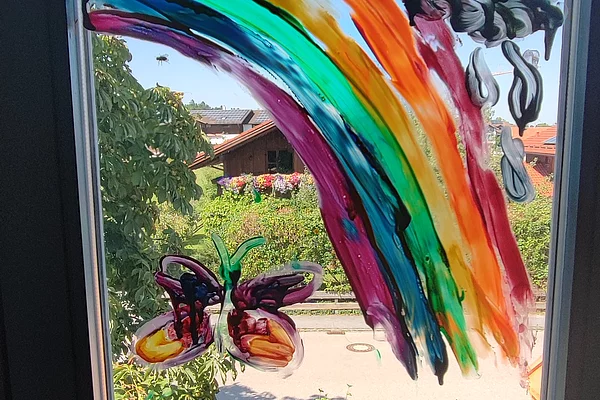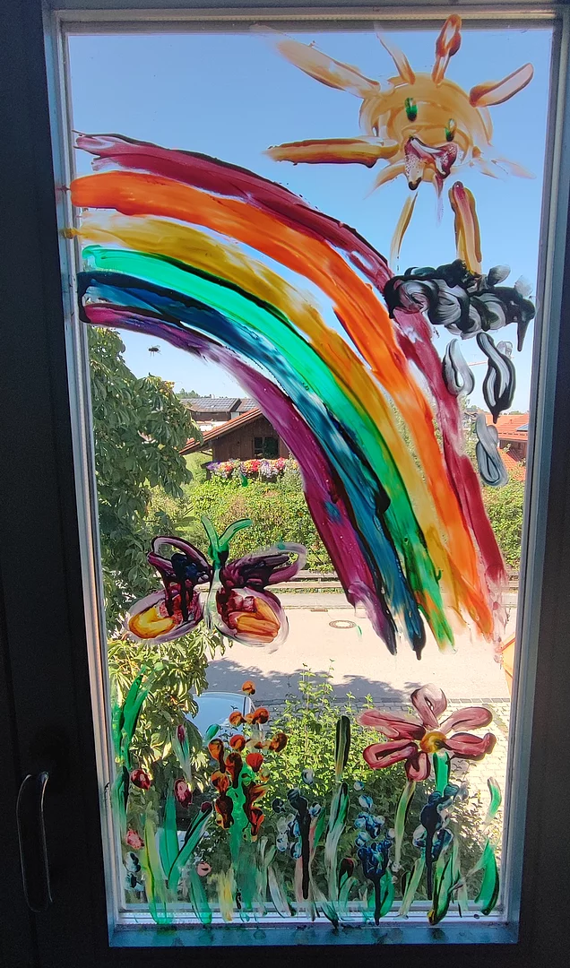 Aufgabe war es sich ein Fenster des Hauses zu suchen (werden ausgetauscht bei der Sanierung) um sich kunterbunt - mit Gemälden, Wünschen und positiven Botschaften - zu verewigen. So bleiben diese kleine Botschaften der Kinder und Familien im Haus, bis die Fenster erneuert werden. Es war eine wunderbare Aktion bei der die Kinder und Elternsehr kreativ mitgewirkt haben. Danach verließen alle offiziell das Gebäude Kindervilla KUNTERBUNT!