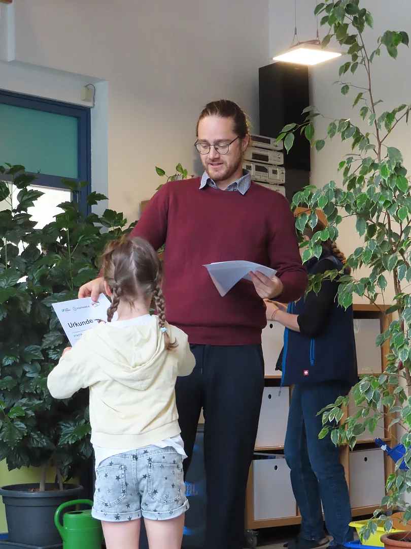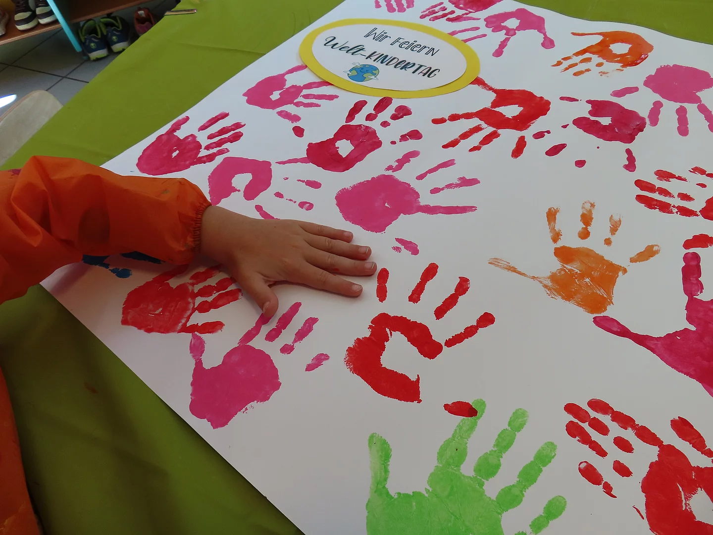 Im Turnraum gab es eine Bewegungslandschaft, in der großen Halle gab es einen Picknickplatz und frisch gebackenen Waffeln, in der Drachengruppe drufte man Raupen aus Bügelperlen basteln und in der Mäusegruppe konnten alle Kinder einen Handabdruck für das große Weltkindertag-Plakat machen. Im "Grünen Salon" der Mehrzweckraum der Einrichtung, gab es stündlich ein Bilderbuchkino mit tollen Geschichten. Alle Kinder waren im Haus unterwegs und genossen die besonderen Aktivitäten.