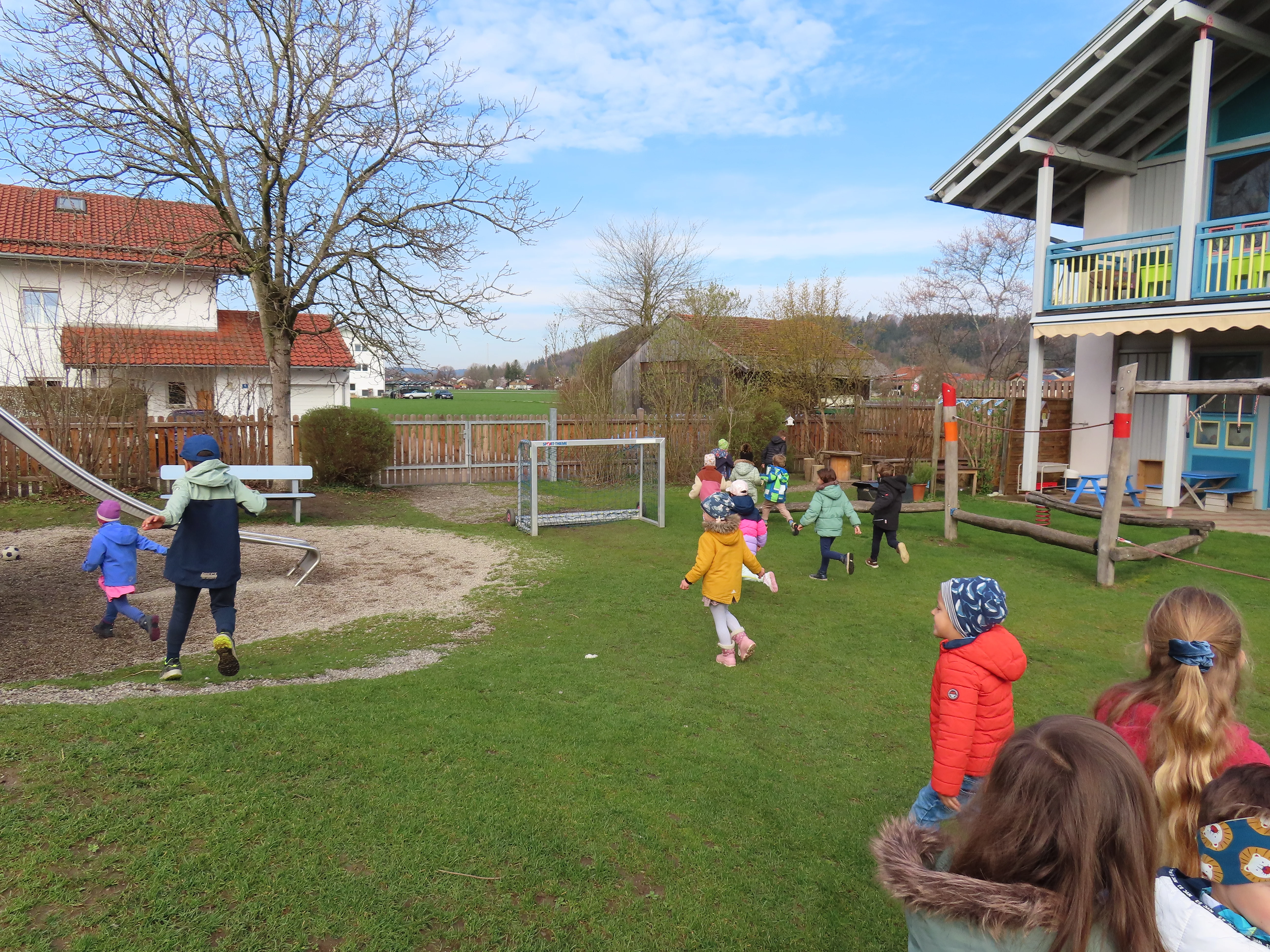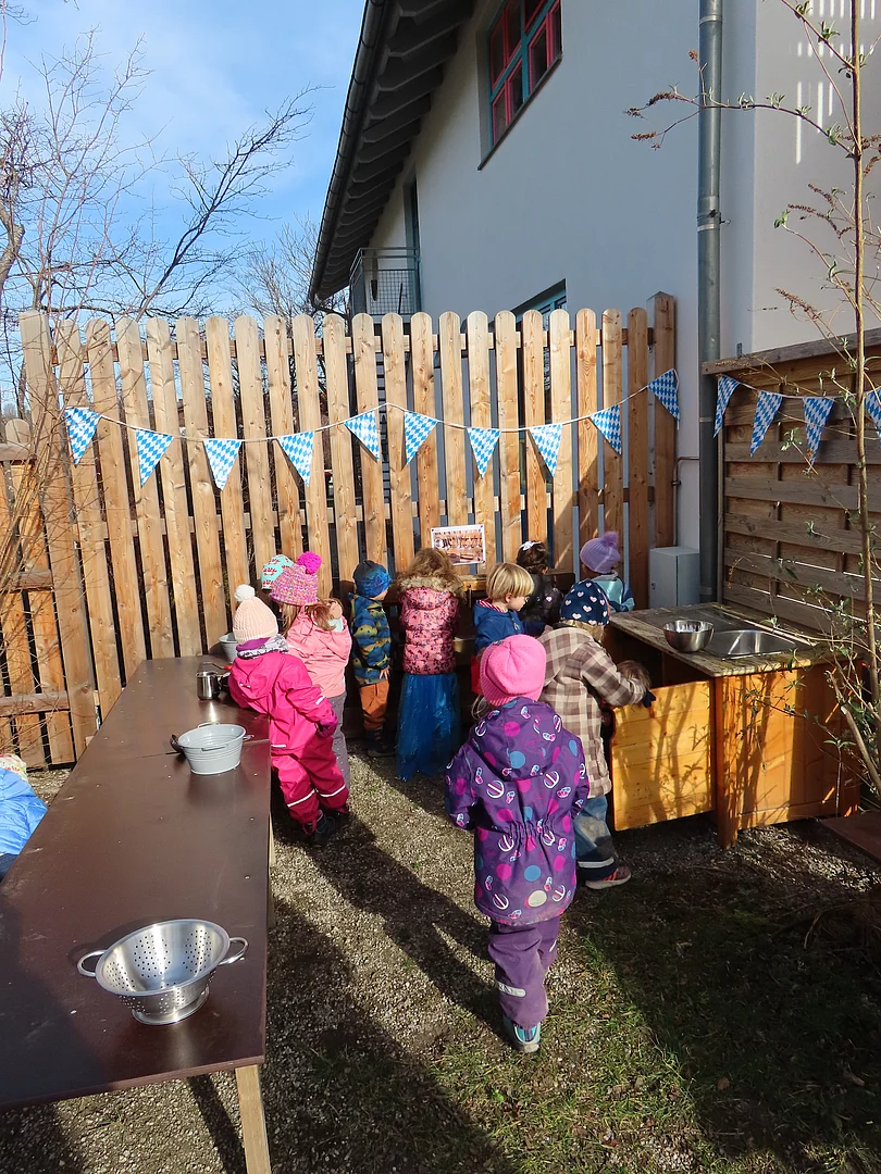 Februar 2024 Der Winter ist vorbei und die Matsch- und Gartensaison startet wieder. Nach kleinen Umbaumaßnahmen und Ergänzungen gab es im Februar die feierliche Eröffnung des neu gestalteten Spielbereichs im Garten der Kindervilla Kunterbunt.