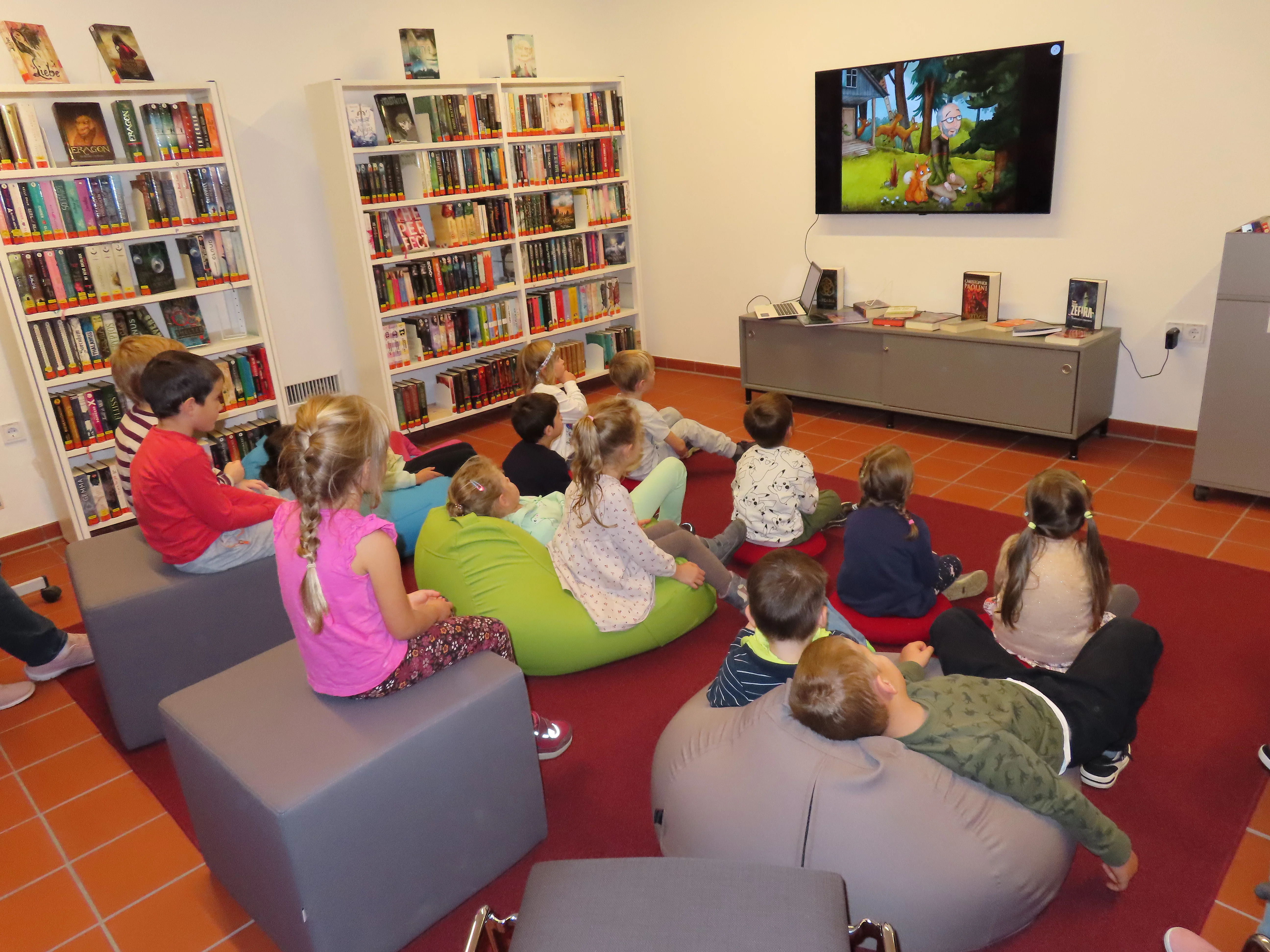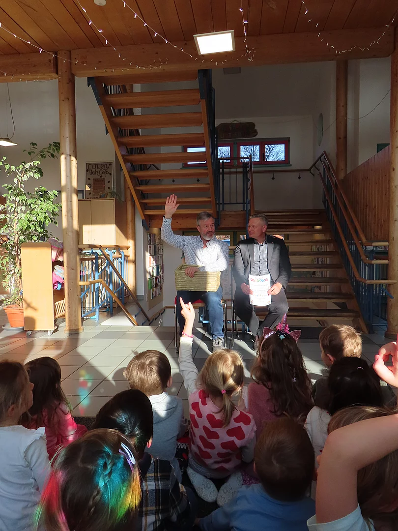 Oktober 2024 Eine neue Kooperation unter Kollegen startet. Schon lange leihen wir Kinder- und Sachbücher bei unseren Kollegen der Gemeindebücherei aus und waren ein- bis zweimal zum Bilderbuchkino eingeladen. Ab diesem Jahr dürfen wir regelmäßig einmal im Monat in die Gemeindebücherei (in der Kulturmühle) zu einer Vorlesestunde oder einem Bilderbuchkino kommen. Denn Vorlesen ist wichtig!