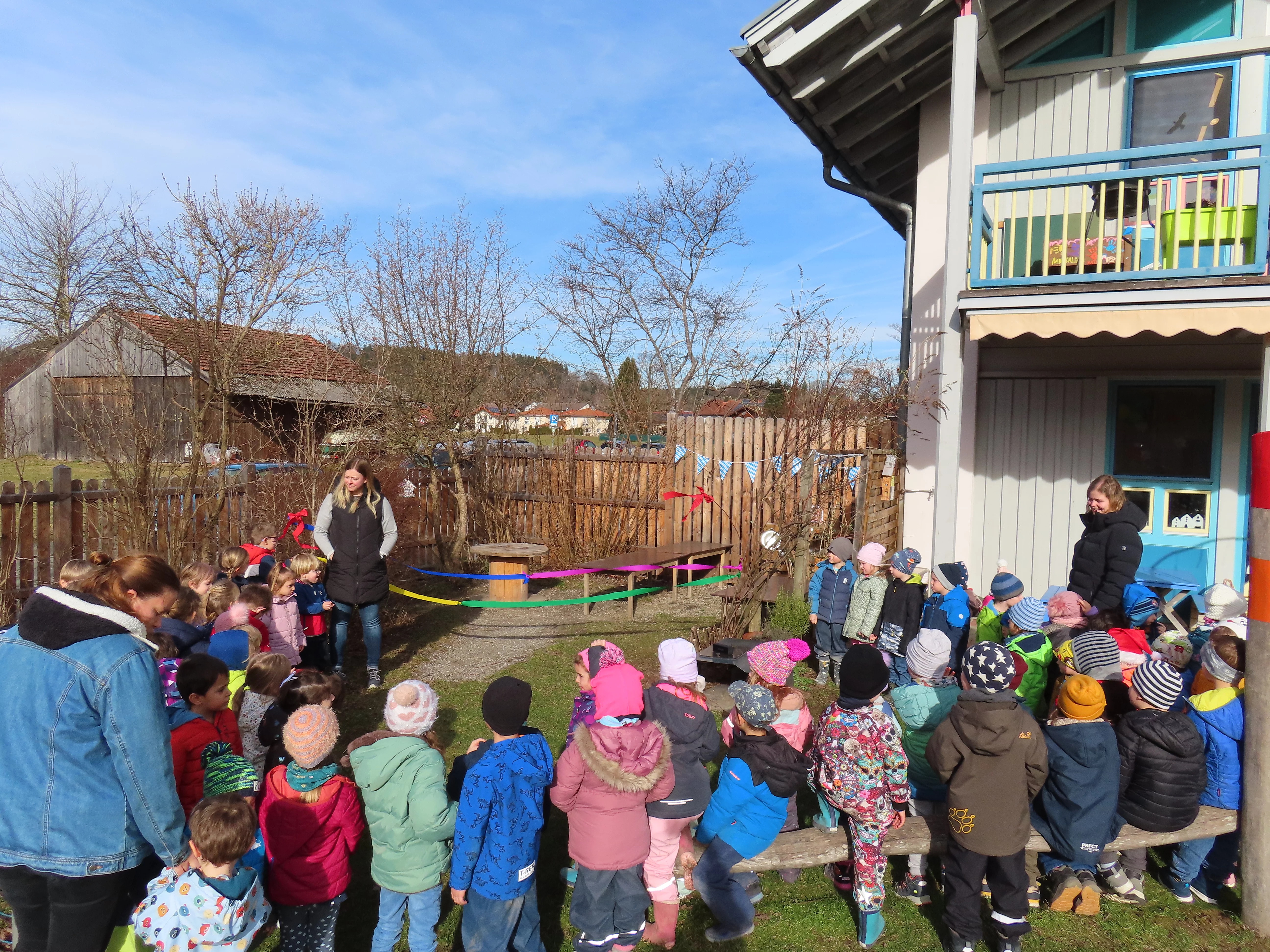 Als alle Kinder versammelt waren erklang die Bayernhymne und die Bänder wurden feierlich von je einem Kind der verschieden Kindergartengruppen mit einer großen Schere durchgeschnitten. Anschließend wurden noch die Spielregeln besprochen und schon stürmten die Kinder in den beliebten Spielbereich.